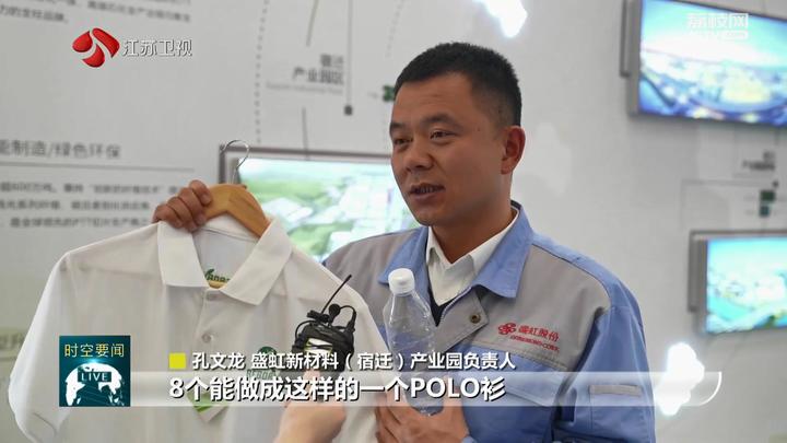 盛虹新材料(宿迁)产业园负责人孔文龙说:“像这样的饮料瓶,8个能做成这样一件POLO衫,34个左右塑料瓶能做成一件冲锋衣。我们50万吨/年的产能,每年能够消耗掉300亿只饮料瓶,相当于减少二氧化碳排放120多万吨。”